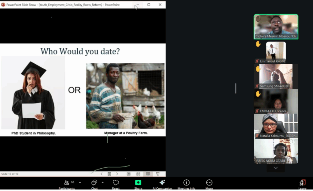 Le thĂšme de cette session, « Le chĂŽmage des jeunes et lâĂ©ducation », a permis dâaborder avec luciditĂ© et responsabilitĂ© une rĂ©alitĂ© qui traverse de nombreux pays africains, et plus particuliĂšrement le Cameroun đšđČ. Les Ă©changes ont mis en lumiĂšre les prĂ©jugĂ©s persistants liĂ©s Ă lâemploi, notamment la valorisation exclusive de certains parcours professionnels, la stigmatisation de lâentrepreneuriat informel, ainsi que la croyance selon laquelle la rĂ©ussite passe uniquement par lâemploi salariĂ© classique.
