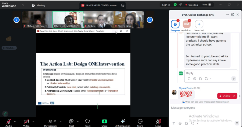 Hier 29 janvier 2926 sâest dĂ©roulĂ©e la 5á” session dâĂ©change virtuelle du projet EYES â Virtual Exchange, un espace de dialogue ouvert, bienveillant et profondĂ©ment inspirant, dĂ©diĂ© Ă la jeunesse et aux dĂ©fis majeurs auxquels elle fait face aujourdâhui đ±.